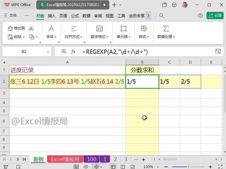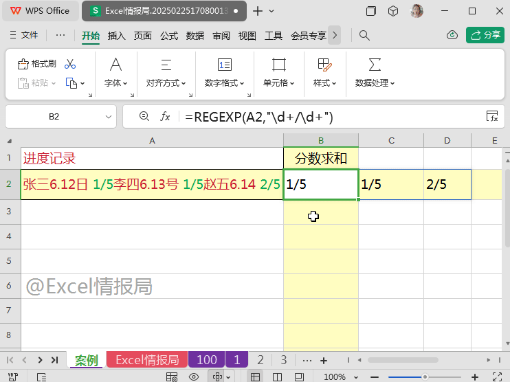 \d+/\d+:表示 “数字/数字”格式,即所有分数的可能性。包括但不限于本例中的:1/5,1/5,2/5。