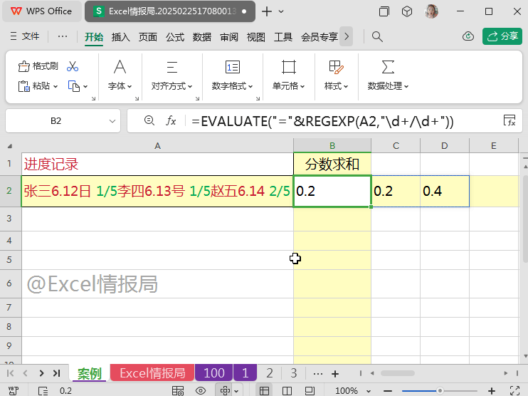A2单元格中为混合内容。包括汉字,数字,标点(.),运算符(/除号)等。我们的目的很清晰,就是将混合内容中的分数:1/5(五分之一),1/5(五分之一),2/5(五分之二)提取出来然后求和,即1/5+1/5+2/5=4/5。