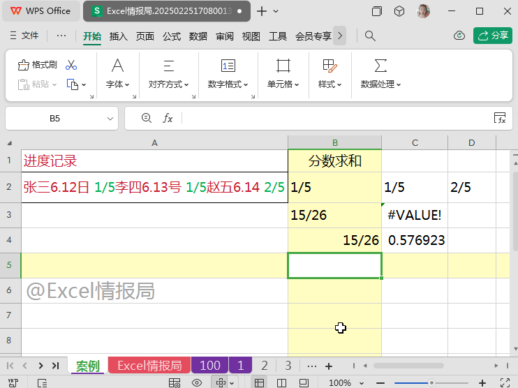 1/5,1/5,2/5三个分数,被默认当做日期格式数据:5月1日,5月1日,5月2日 处理了,而日期格式数据的本质又是数值,所以直接乘以1后,变成了{45662,45662,45693},求和结果自然是错误的。