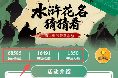 花名竞猜掀热潮本次活动浏览量达68585次累计2020位“水浒迷”报名挑战1850位好汉勇闯花名关卡16491次智慧交锋