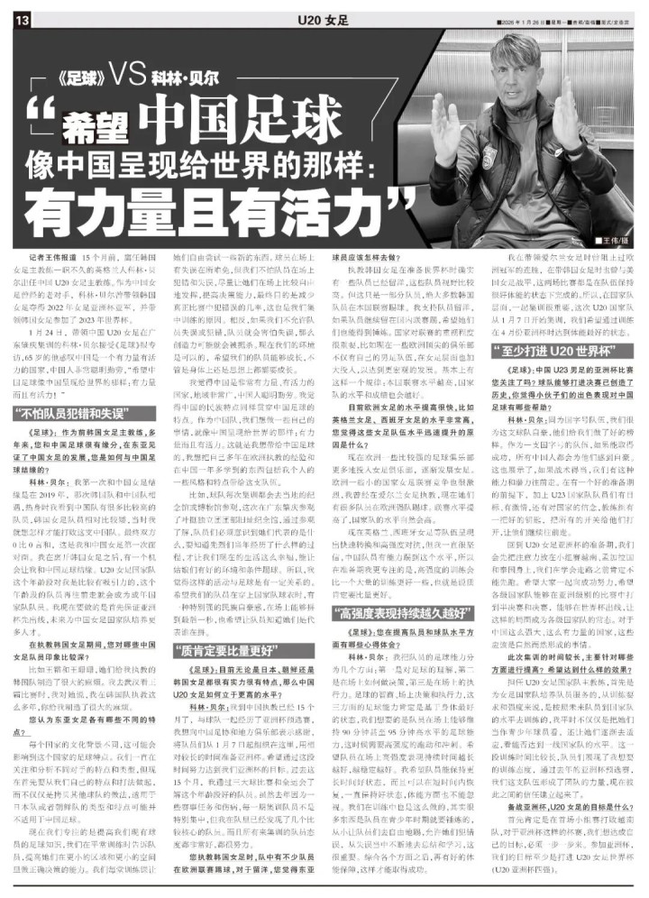 科林·贝尔:我第一次和中国女足结缘是在2019年,那次韩国队和中国队相遇,热身时我看到中国队有很多比较高的队员,韩国女足队员相对比较矮,当时我就想怎样才能打败这支中国队。最终双方0比0言和,这是我和中国女足第一次面对面。我在离开韩国女足之后,有一个机会让我和中国足球结缘。U20女足国家队这个年龄段对我是比较有吸引力的,这个年龄段的队员再往前走就会成为成年国家队队员。我现在要做的是首先保证亚洲杯先出线,未来为中国女足国家队培养更多人才。