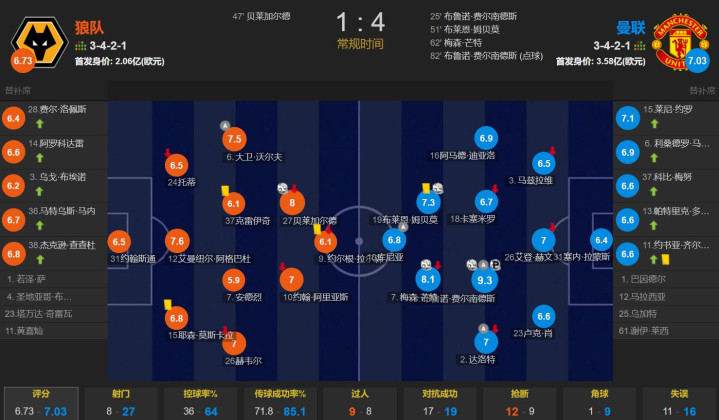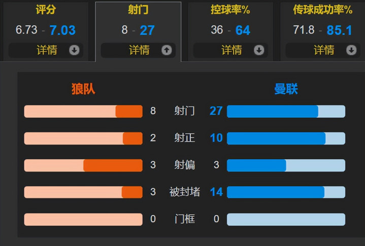 全场比赛,曼联的控球率为64%,一共有27次射门,其中10次射正;狼队一共有8次射门,其中2次射正。