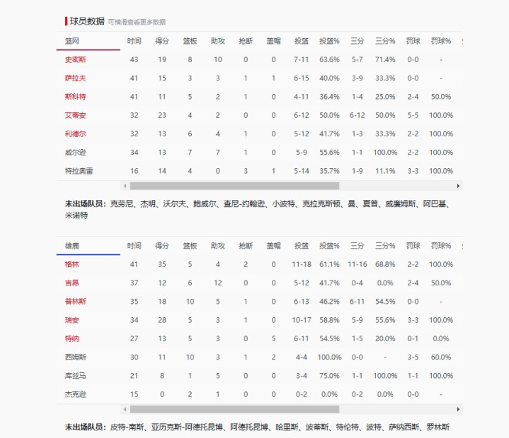 雄鹿数据(32-49):杰里科-西姆斯11分10篮板2盖帽;乌斯曼-迪昂12分6篮板12助攻;托里恩-普林斯18分10篮板5助攻;AJ-格林35分5篮板4助攻2抢断;科马克-瑞安28分5篮板;迈尔斯-特纳13分5篮板5盖帽。