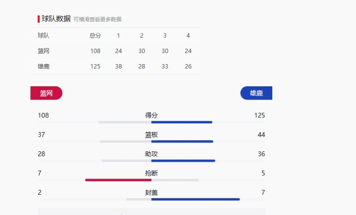 休息归来,篮网保持高效进攻火力,利德尔和史密斯内外开花连续两节得分30+。雄鹿方面,格林和普林斯外线下起三分雨合计飙中七记三分,继续扩大领先。三节战罢,雄鹿99-84雄鹿。末节决战,大比分领先的雄鹿稳扎稳打,没有给篮网任何反扑机会,分差一直在15分上下徘徊,比赛随时间流逝中失去悬念。最终全场比赛结束,雄鹿125-108大胜篮网。