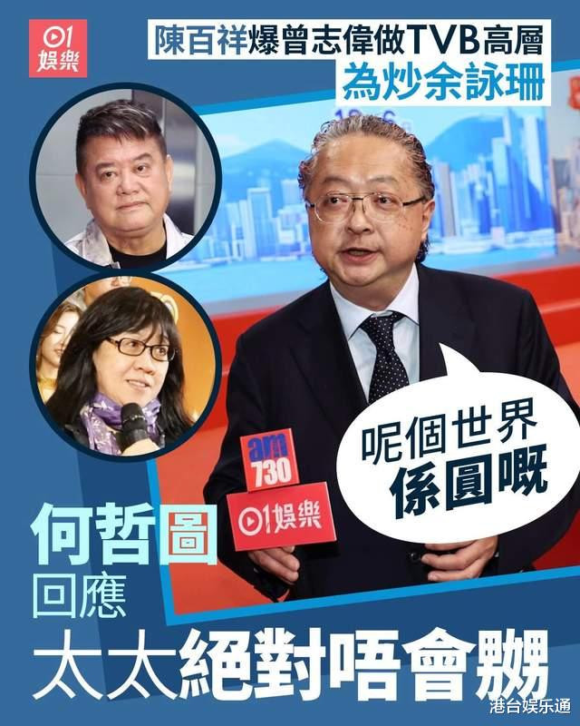 针对早前陈百祥(叻哥)声称“曾志伟回TVB当高层是为了炒余咏珊鱿鱼”的说法,“何哲图(余咏珊丈夫)表示,叻哥一向喜欢在不同场合说不同的话,夫妻俩只当他是在开玩笑,并不觉得曾志伟回巢是为了打击谁。