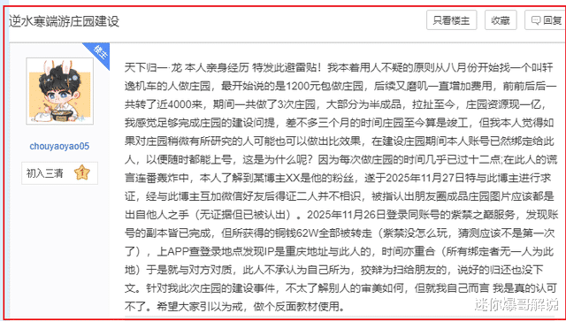 看到这位玩家晒出的庄园成果,社交平台的大伙笑作一团,逆水寒游戏里建筑大佬那么多,价格也都是明码标价,从100块盲盒到上万元的顶级作品应有尽有,还有人被所谓的“大师”给骗了啊?